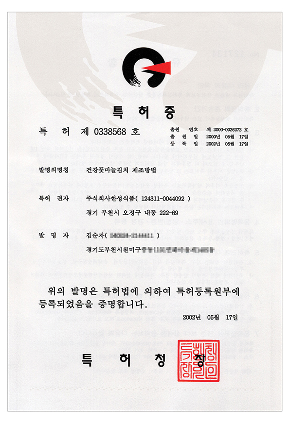 | 3 | 2002. 05. 17 | 0338568 | 건강풋마늘김치 제조방법 |