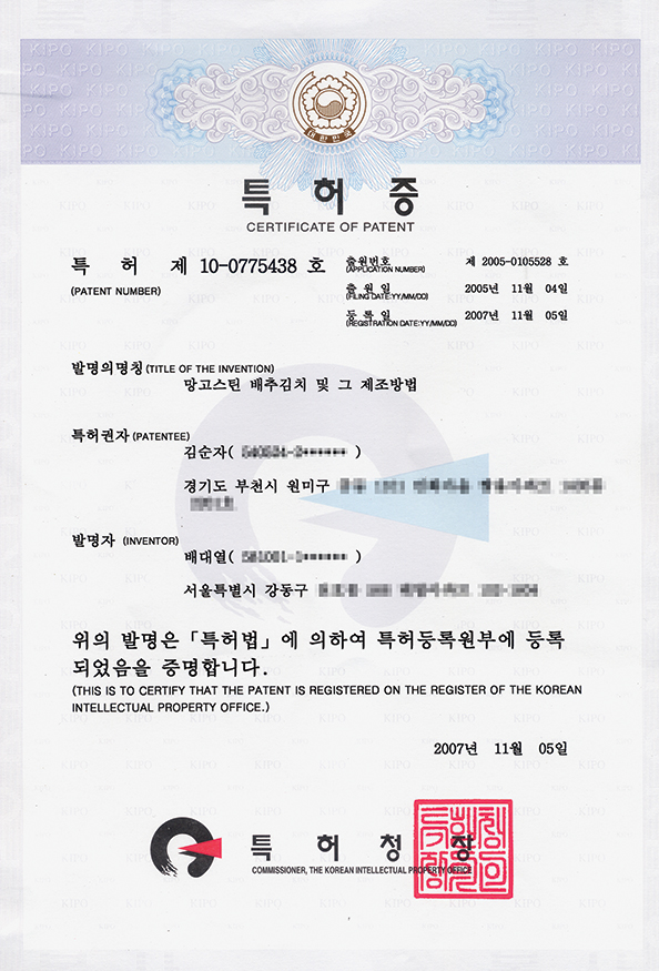 | 19 | 2011. 08. 01 | 10-1054941 | 백김치 막걸리 제조방법 |